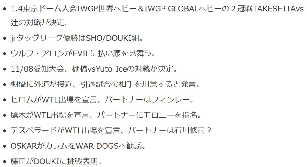 - 1.4東京ドーム大会IWGP世界ヘビー&IWGP GLOBALヘビーの2冠戦TAKESHITAvs辻の対戦が決定。
